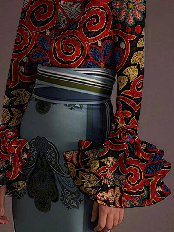 Puff Sleeves Asymmetric Floral Printed Split-Joint Lapel Blouses&Shirts Tops