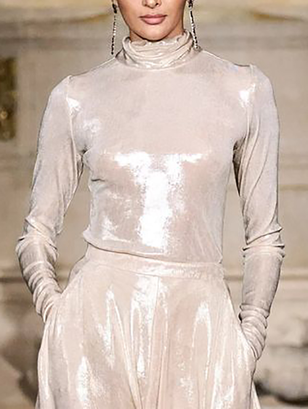 Long Sleeves Shiny Solid Color High Neck T-Shirts Tops
