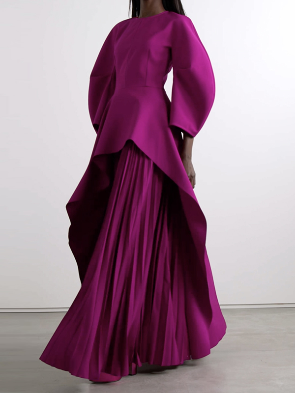 Long Sleeves Loose Pleated Solid Color Split-Joint Tiered Round-Neck Maxi Dresses