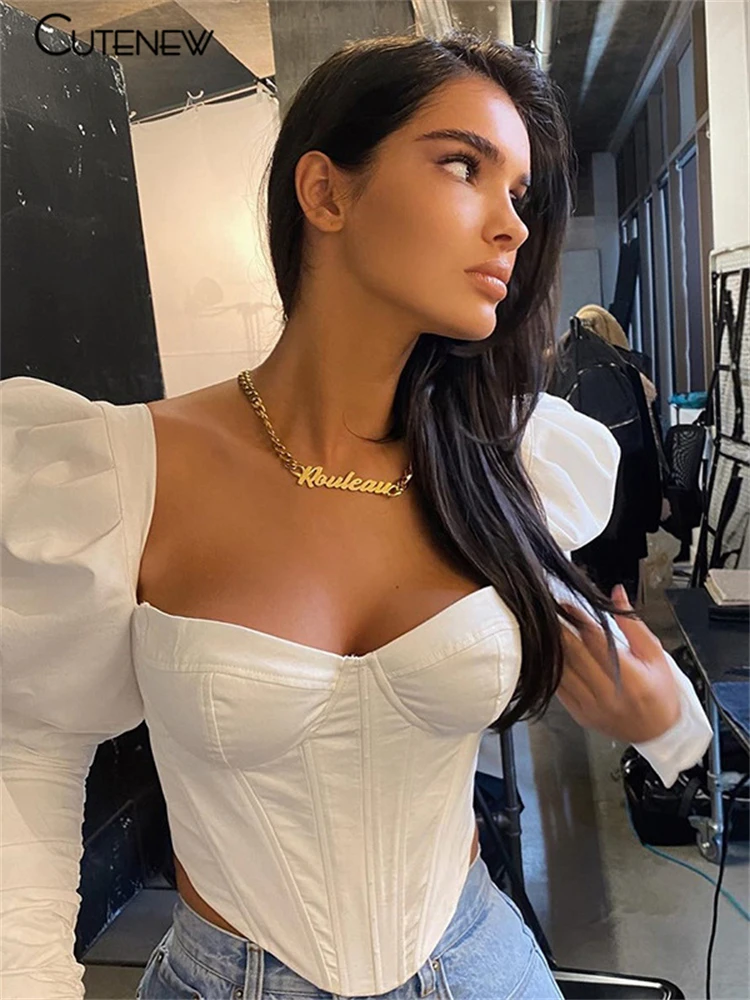 Elegant Romantic Irregular Croped Corset Top Women Stylish Puff Sleeve Vacation Crop Top Skinny Casual Streetwear Female