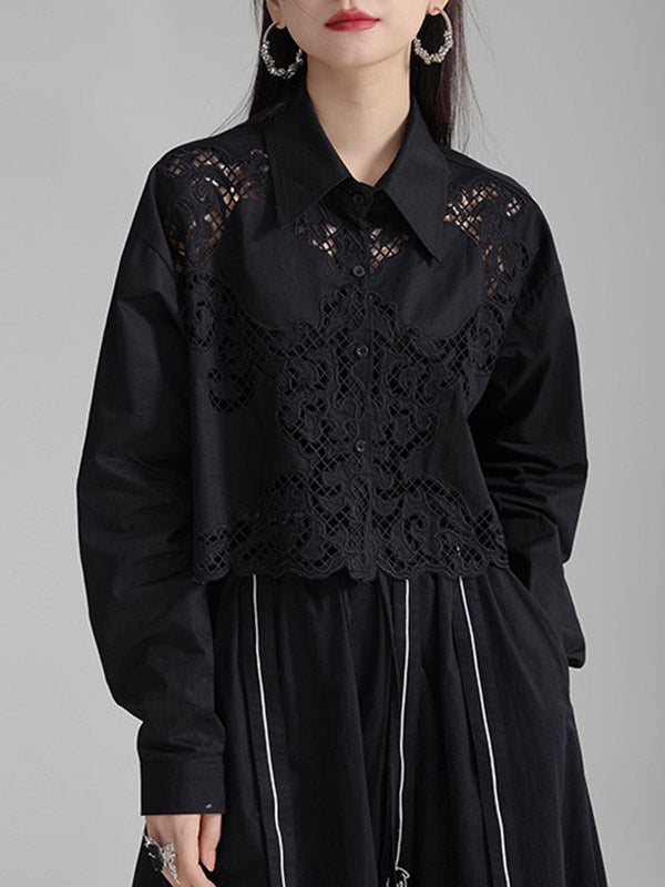 Long Sleeves Loose Buttoned Hollow Solid Color Lapel Blouses&Shirts Tops