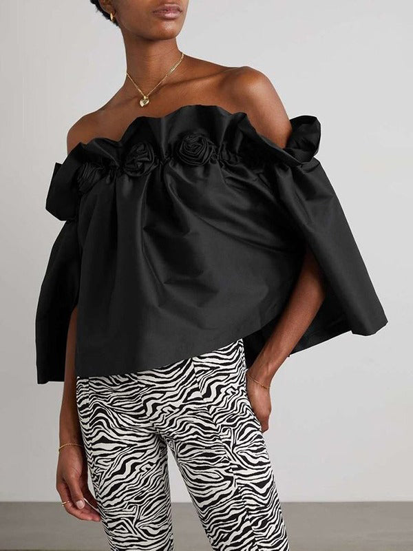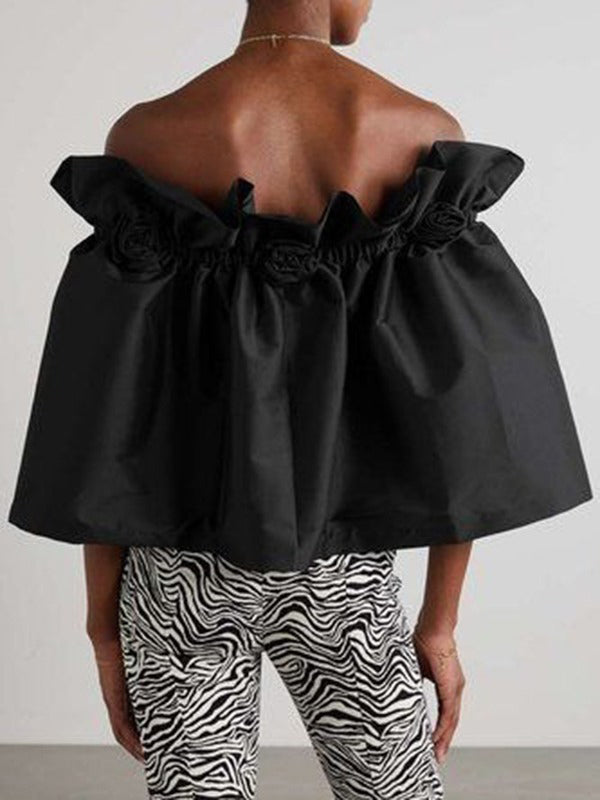 Loose Short Sleeves Elasticity Floral Pleated Solid Color Off-The-Shoulder Blouses&Shirts Tops