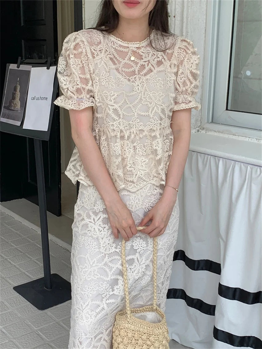 Chic Slim Hollow Out Blouses Women Florals Summer 2024 Sets Office Lady High Waist Work Wear Long Skirts Suits