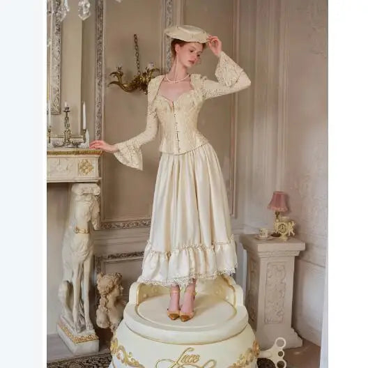 French Retro Court Style Heavy Industry Lace Fishbone Shirt Women Top Long Sleeve Square Neck Temperament Slim Blouses Women