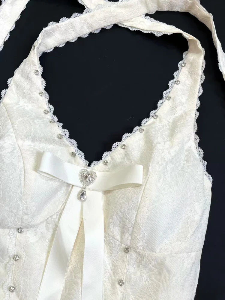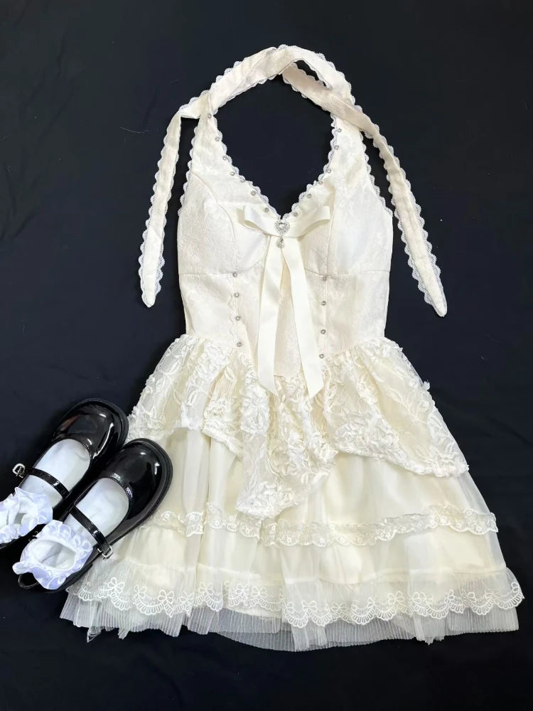 Elegant Sweet Thin 2piece Set Dress Women Design Chic Bow Slash Neck Sleeveless Lace Dresses Female Fashion Cute Solid Cardigan