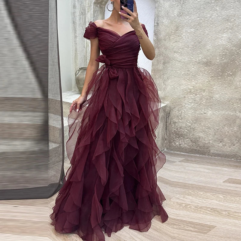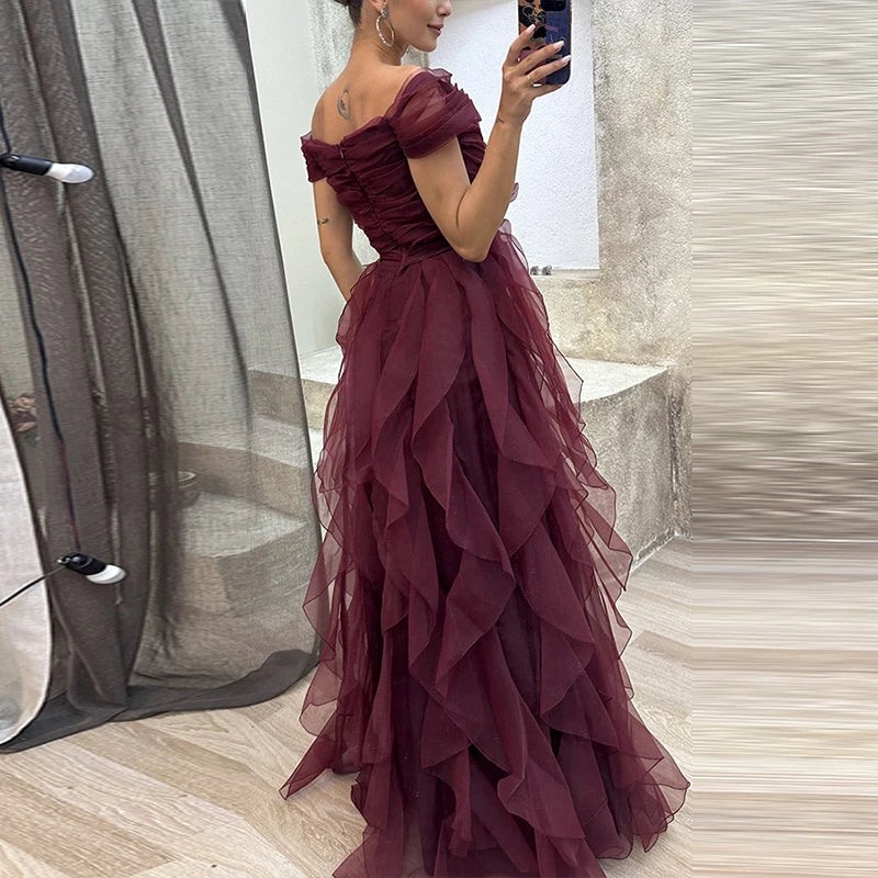 Sexy Strapless Ruffle Mesh Bridesmaid Dresses Women Spring Backless Hollow Long Party Dress Summer High Waist Bow Hem Maxi Dress