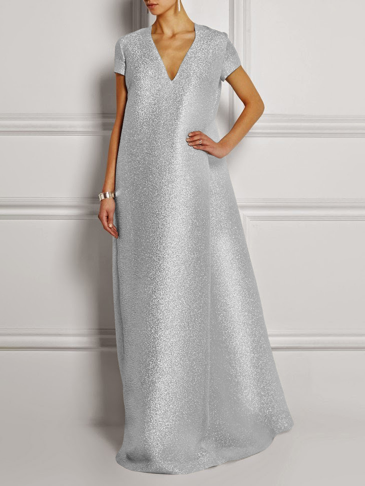 Loose Short Sleeves Shiny Solid Color V-Neck Maxi Dresses