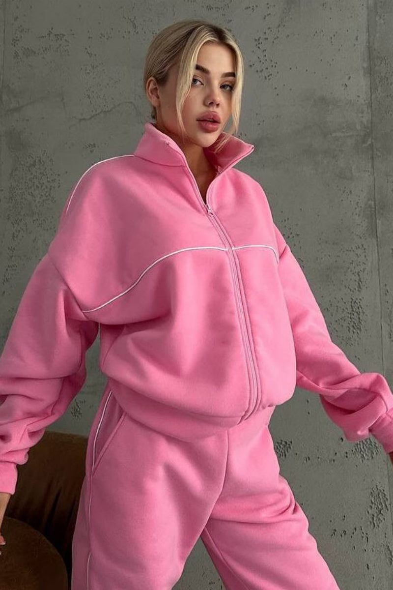 Solid Color Long-sleeved Zip-up Sweatshirt and Elastic Waist Loose Pocket Pants Set