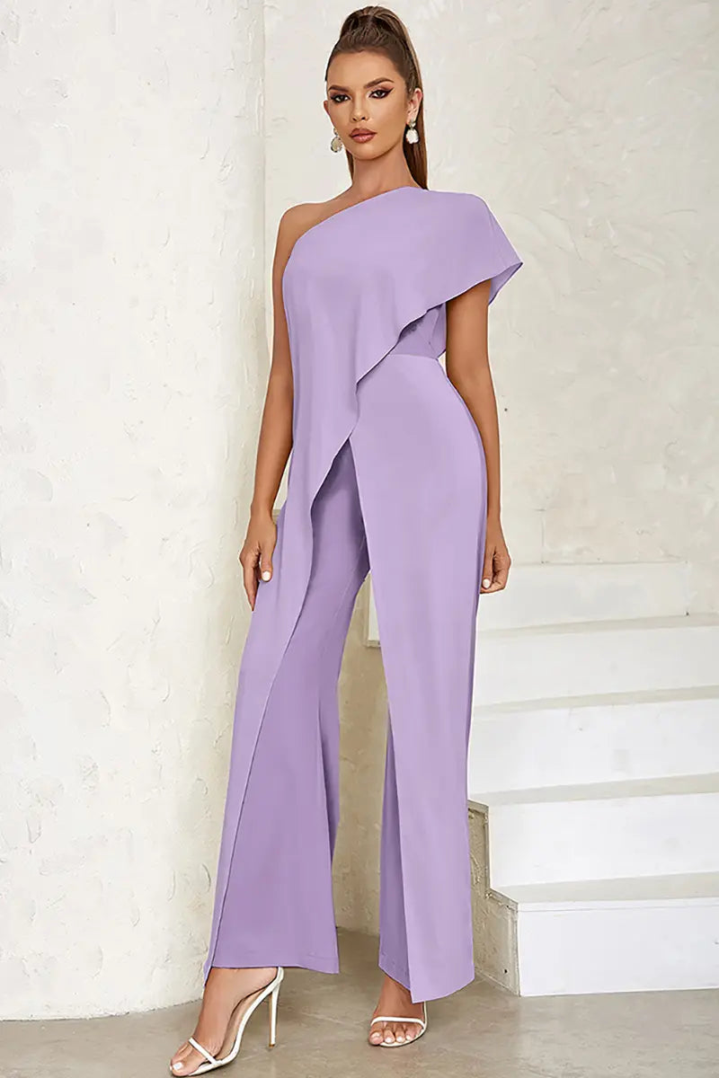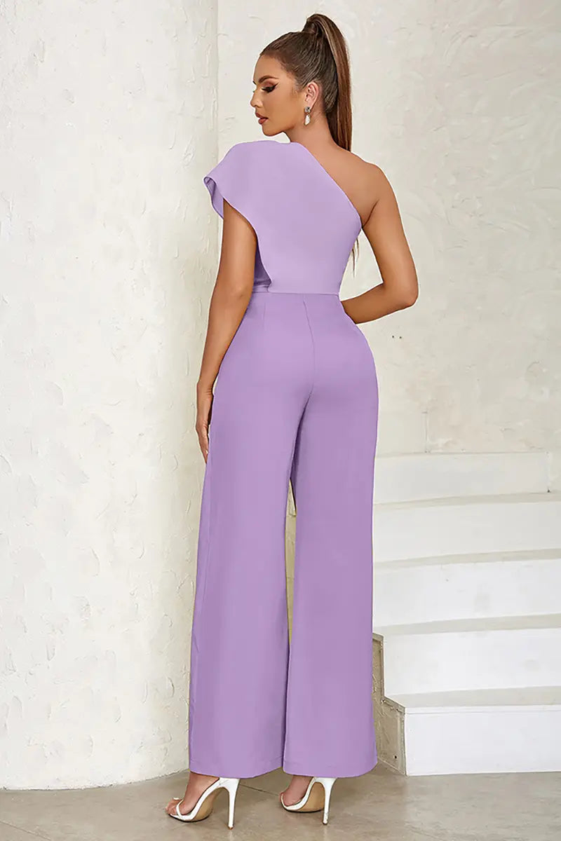 Wide Leg Asymmetric Solid Color One-Shoulder Jumpsuits