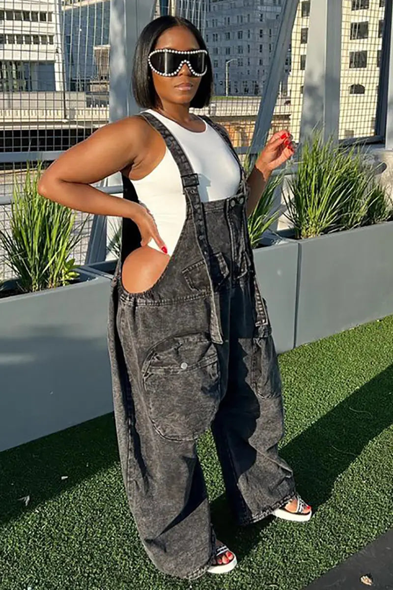 Street Solid Patchwork Pocket Buckle Turndown Collar Sleeveless High Waist Loose Denim Jumpsuits