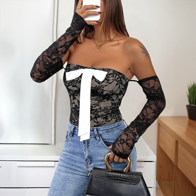 Lace Patchwork Contrast Color One Shoulder Bow Tie Jumpsuit