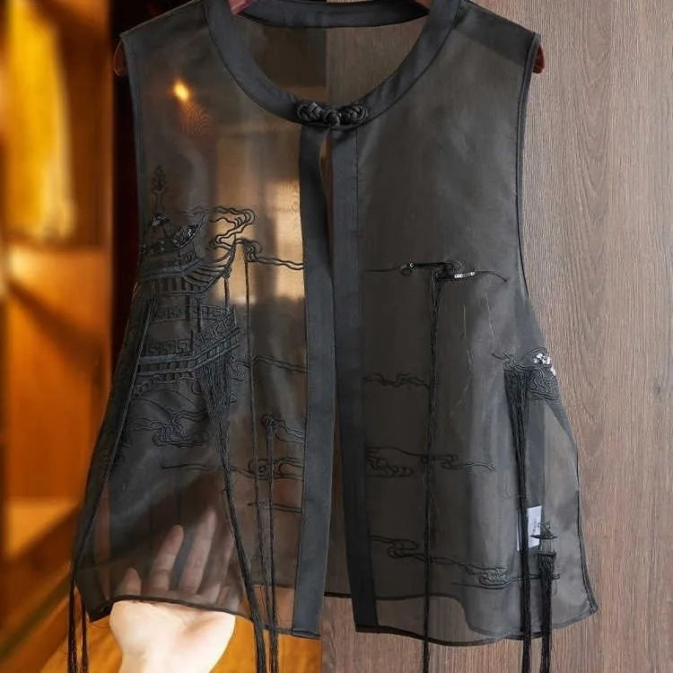 Vintage Vests Women Sheer Chinese Style Black Summer Allmatch Mom Clothing Embroidery Design Outwear Tassel Fashion Sleeveless