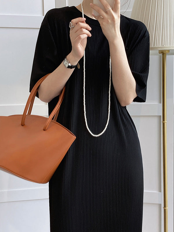 Urban Loose Pleated Solid Color Round-Neck Mini Dresses