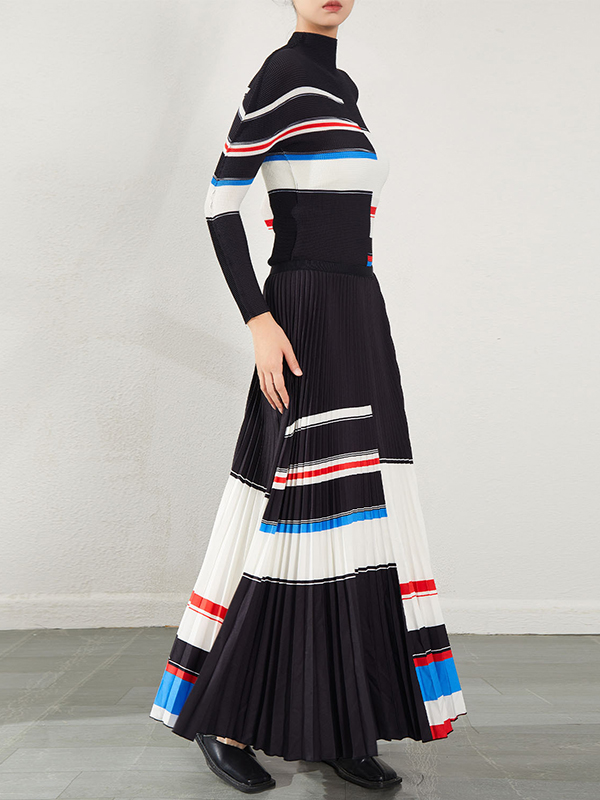 A-Line Long Sleeves Contrast Color Pleated Mock Neck Two Pieces Set