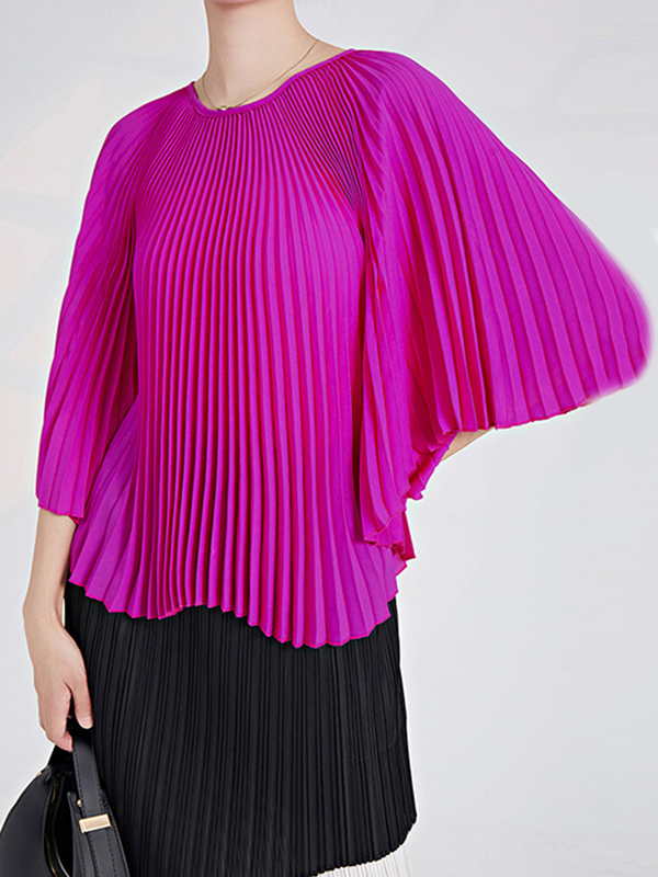 Batwing Sleeves Loose Pleated Solid Color Round-Neck T-Shirts Tops