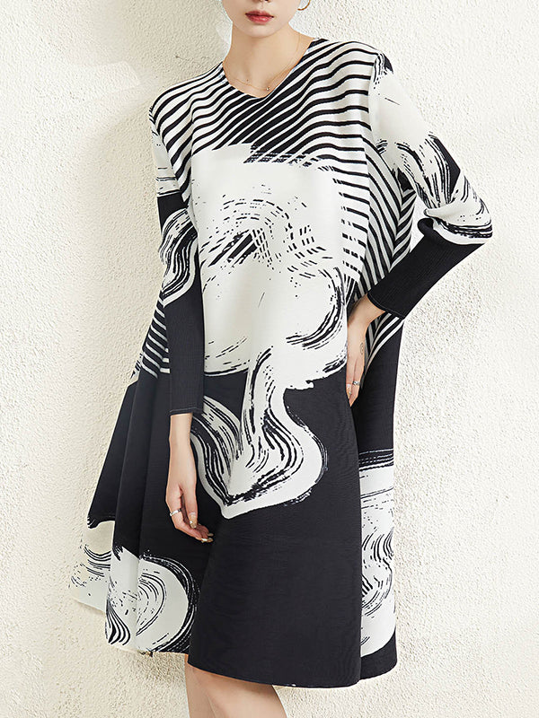 Urban Loose Batwing Sleeves Printed Pleated V-Neck Midi Dresses