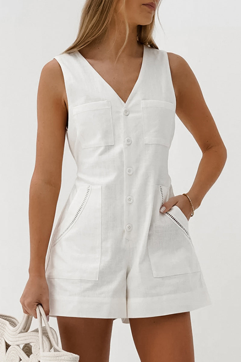 Casual Daily Solid Color Pocket Buttons V Neck Loose Rompers