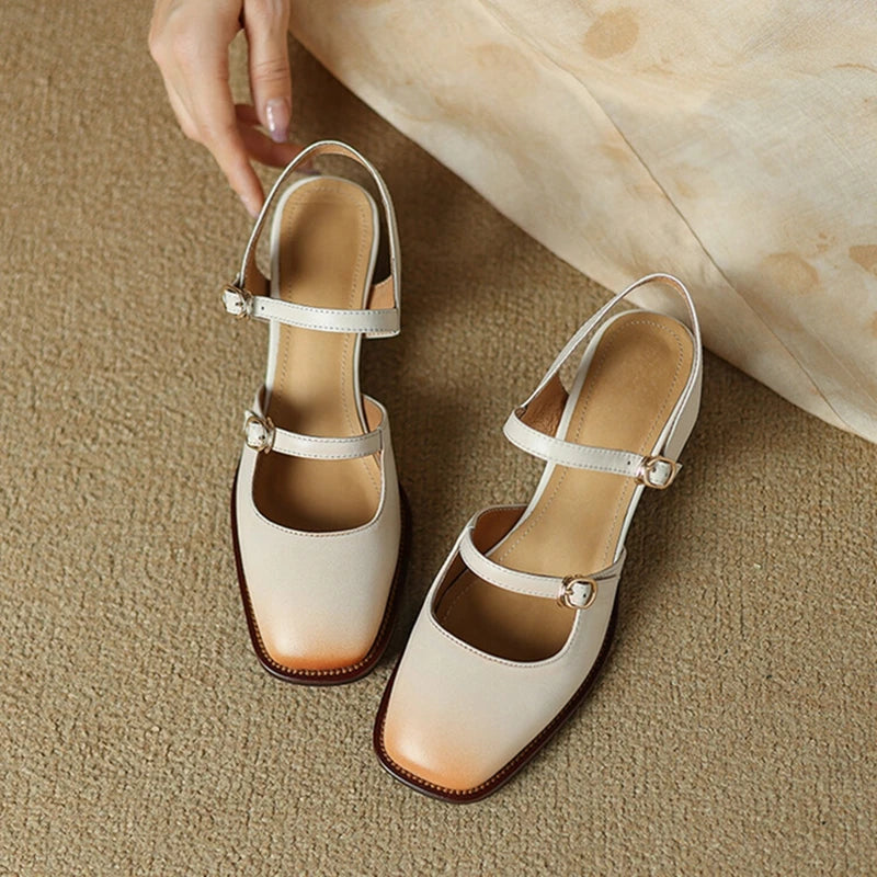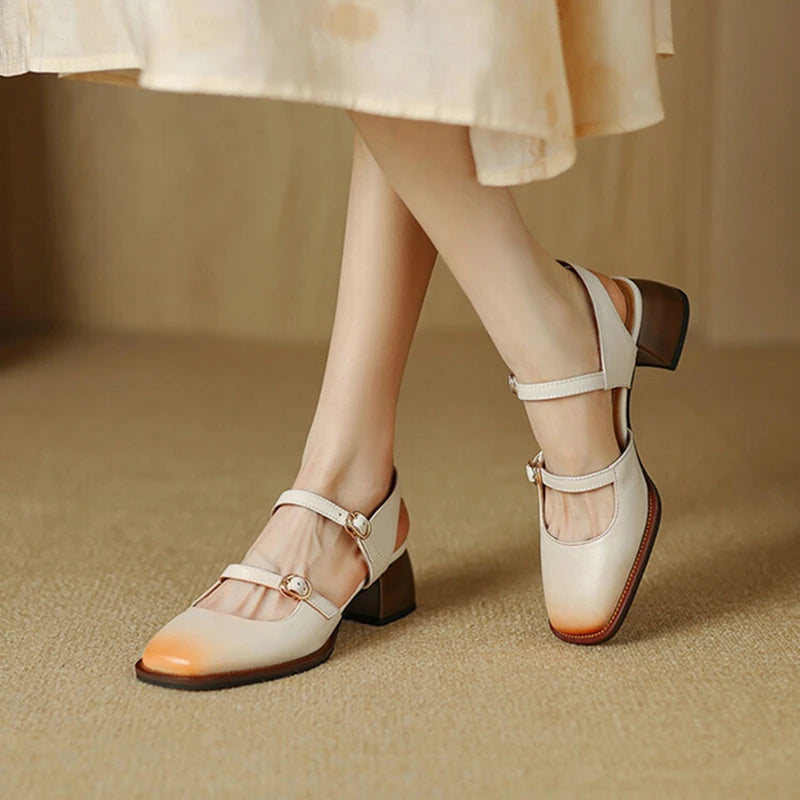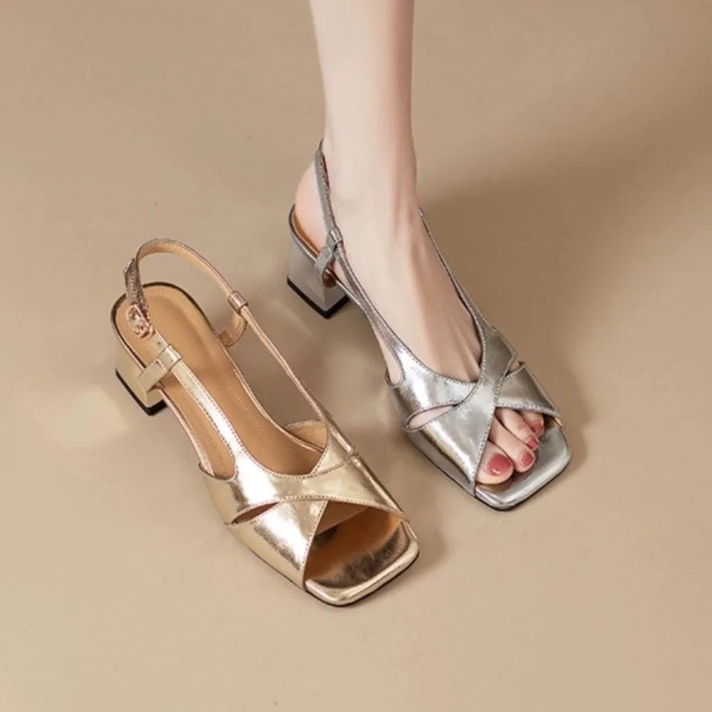 Summer Women Sandals Genuine Leather Shoes for Women Square Toe Chunky Heel Plus Size Shoes Cover Toe Slingback Designer Sandals