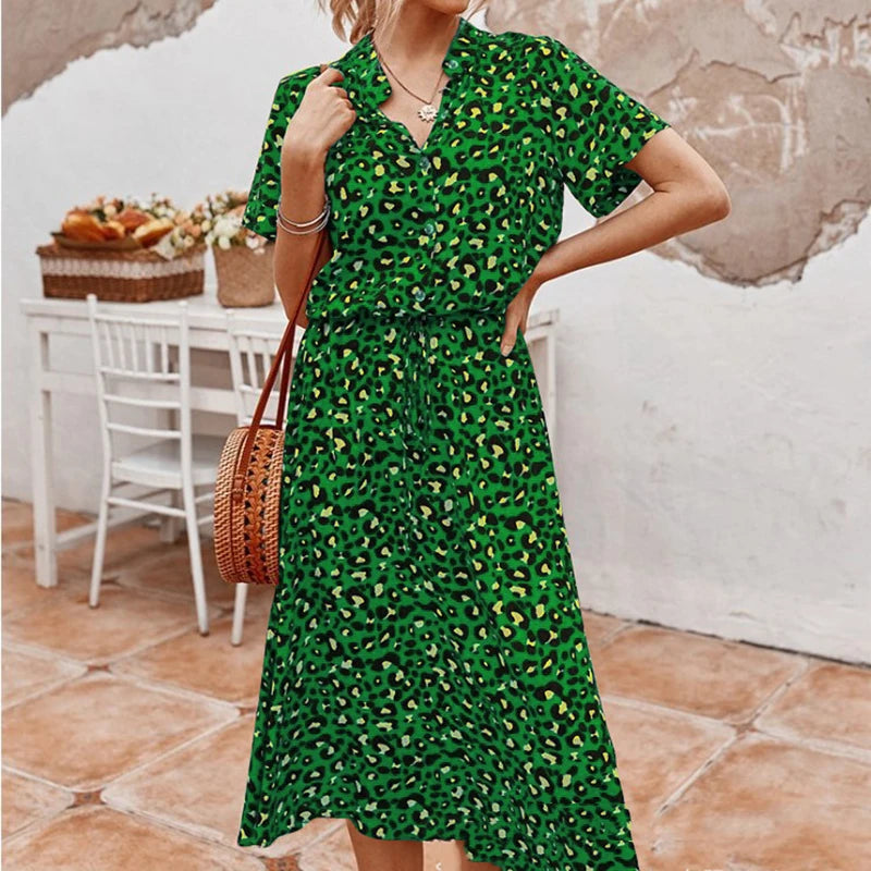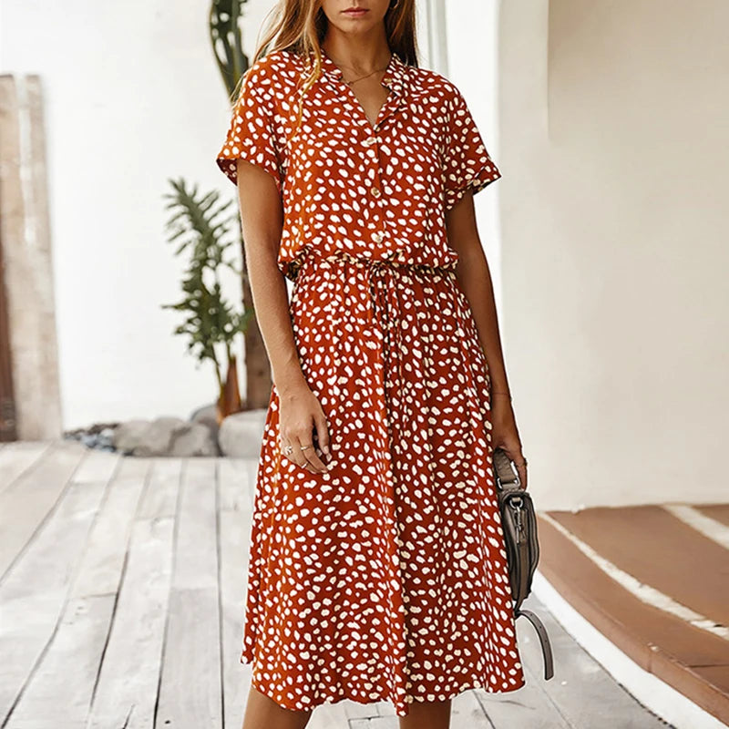 Summer Polka Dot Dress Ladies Leopard Print Shirt Dress Women Midi High Waist Beach Vacation Bohemian Dresses Vestido 21818