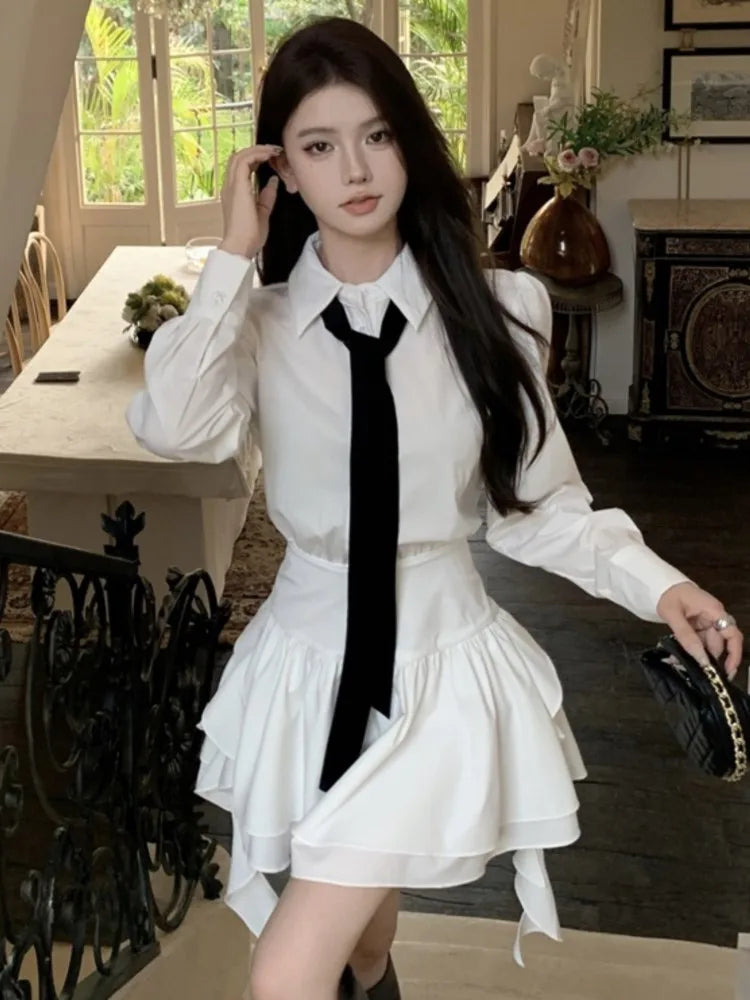 Elegant White Shirt Dresses Korean Preppy Style Long Sleeves Ruffle Party Mini Dress Slim Waist Casual Vestidos Female Outfits