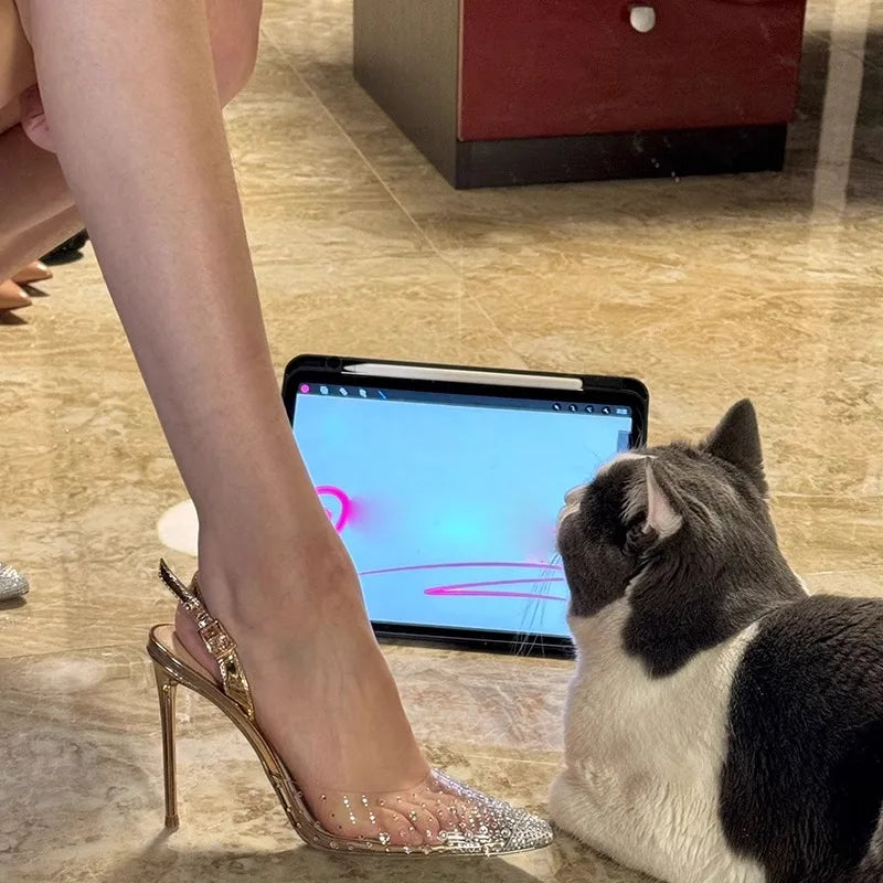 Rhinestone Transparent Pvc High Heels Sexy Gold Pointed Toe Shallow Buckle Strap Stiletto Sandals Women Back Strap Shoes