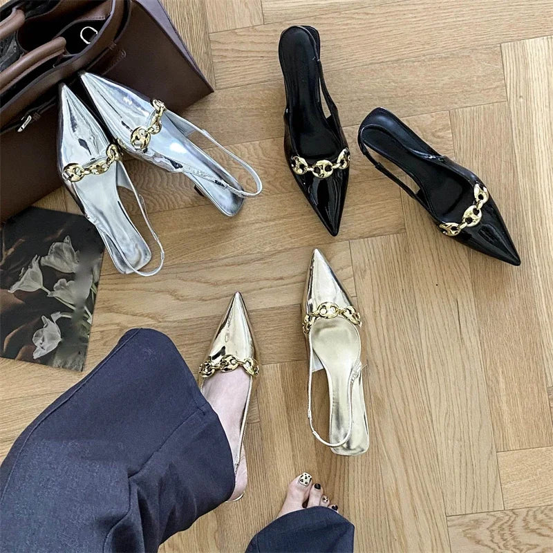 Elegant Metal Decoration Pointed Toe Women Pumps Fashion Thin Low Heels Sandals Casual Dress Mules Shoes