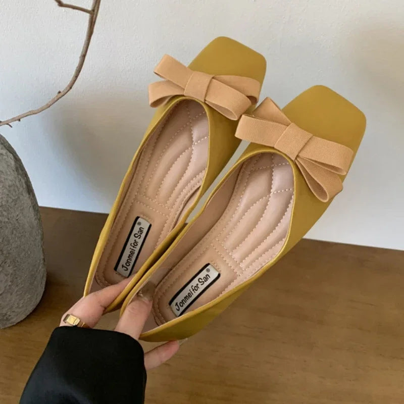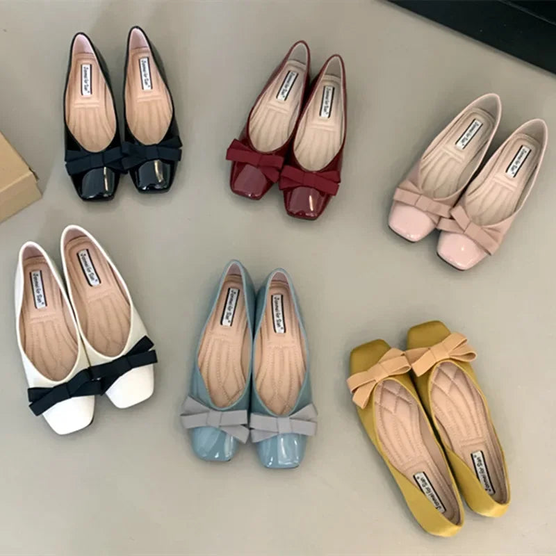 2025 New Fashion Mary Jane Shoes Women Square Toe Flats Shallow Dress Shoe Butterfly Knot Patent Leather Soft Soled Ballet Shoes