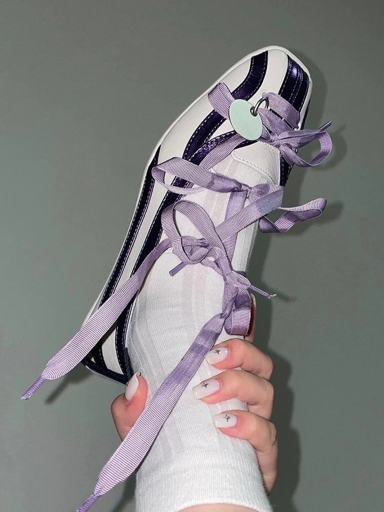 Spring Lolita Square Toe Purple Flat Ballet Shoes Women's New Straps Bow Color Matching Mary Jane Shoes