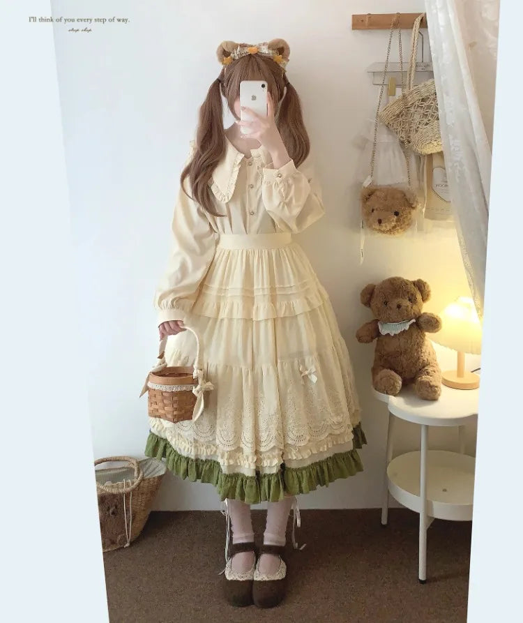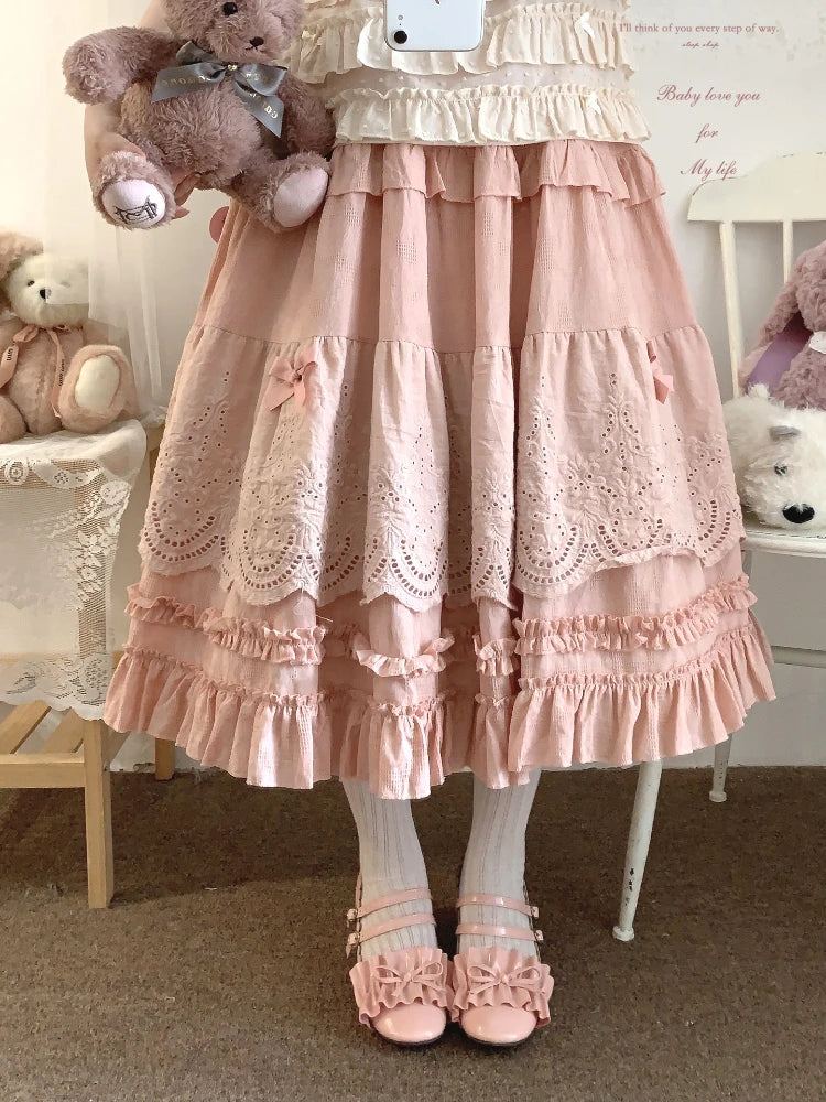 Embroidered Lace Ball Gown Skirts Vintage Bow Selvedge Lotus Leaf Skirt Women Clothing Sweet Age Reduction Kawaii Skirt