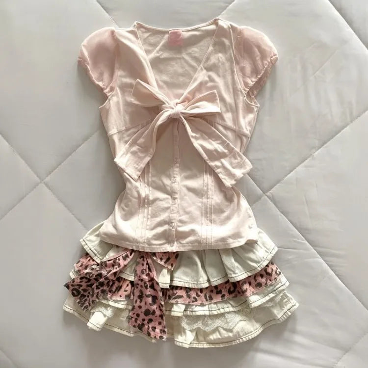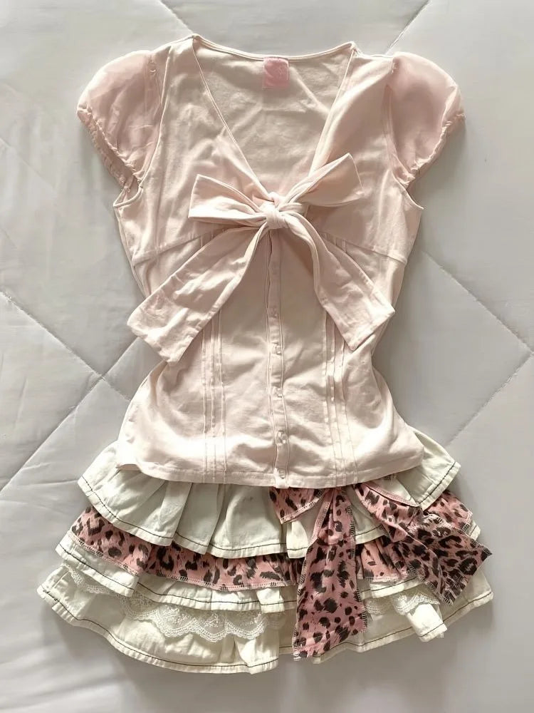 Sweet Pink Vneck Bow Short Sleeve Tshort for Women+ Y2k High Waist Ruched Cake Skirts 2025 Summer New Two Piece Sets