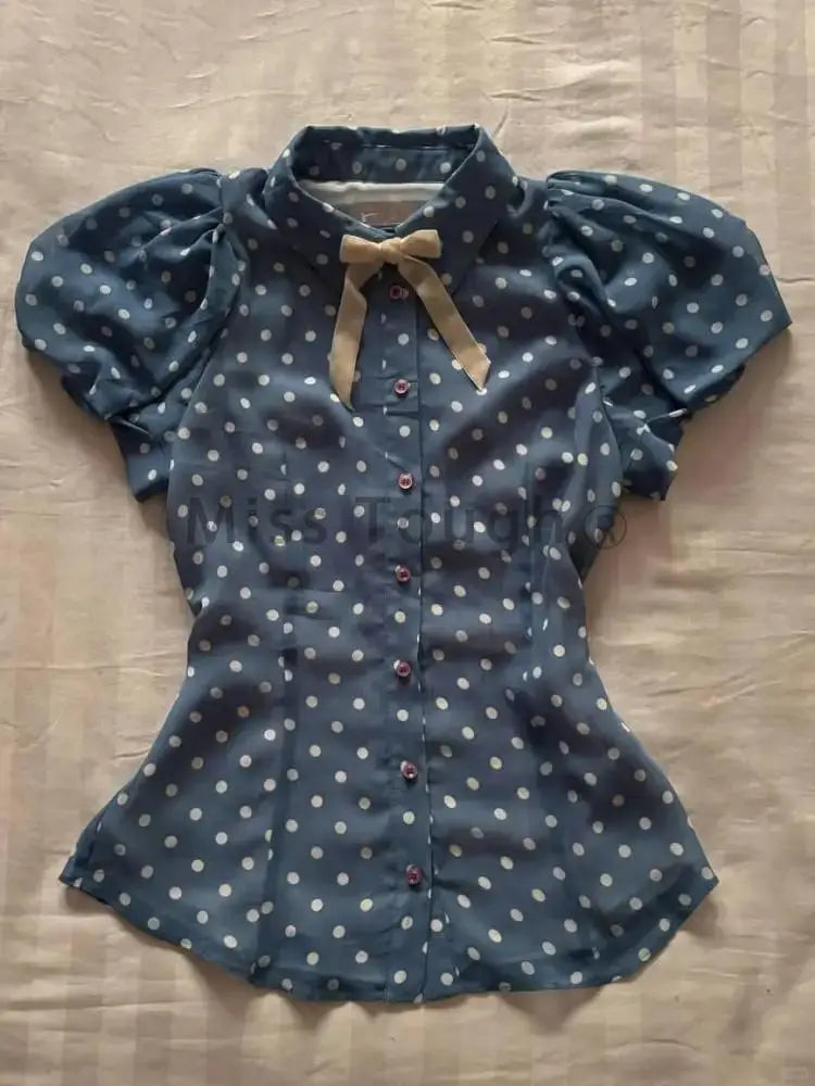 Summer Vintage Slim Thin 2piece Set Women Design Retro Polka Dot Short Sleeve Lapel Tshirts + Lowwaisted Bow Short Skirt New