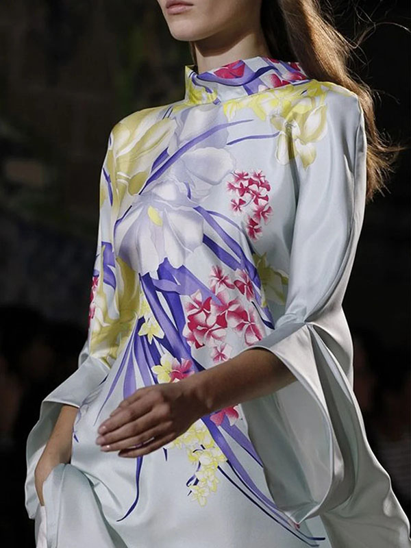 Batwing Sleeves Loose Floral Printed Split-Joint High Neck T-Shirts Tops