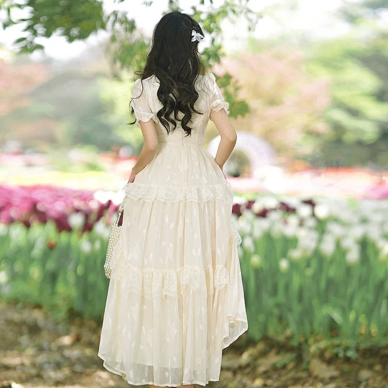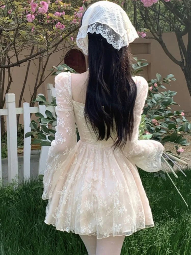 French Style Fairy Dresses for Women Apricot Square Neck Lace Embroidery Mesh Dress Short Sleeve Lady Retro Elegant Robe Vestido