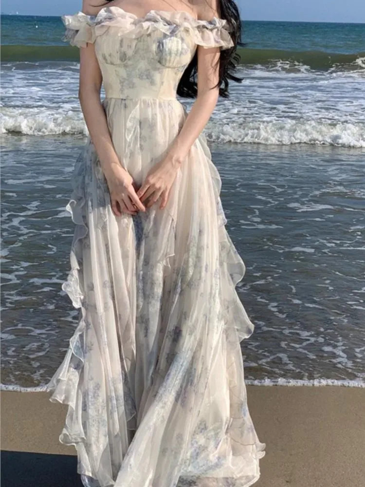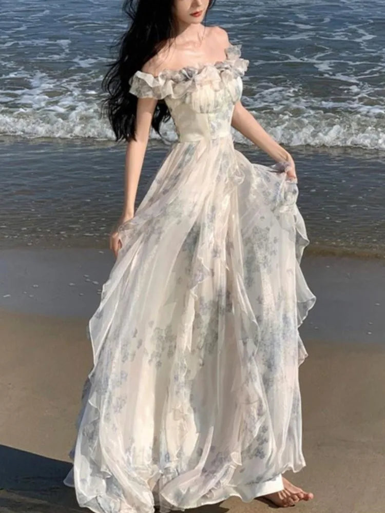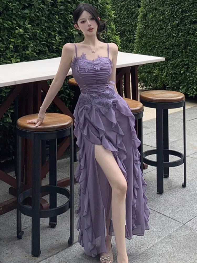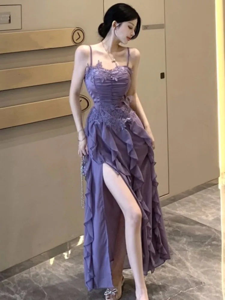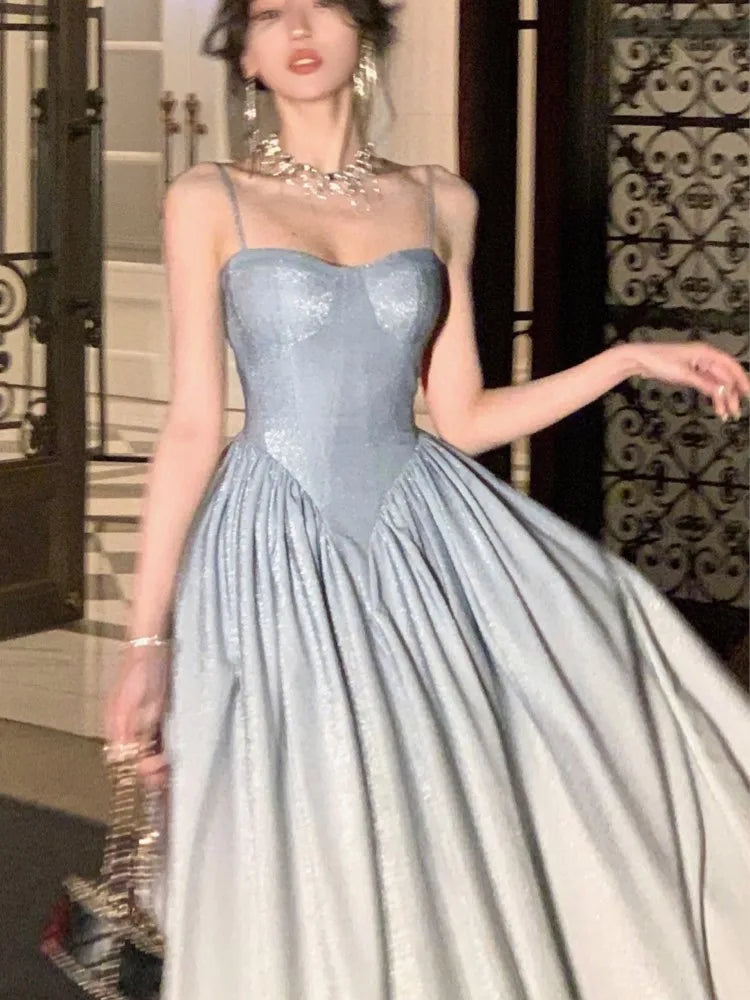 Korean Sweet Fairycore Long Dresses for Women Elegant Spaghetti Strap Ruffles Princess Party Dress Summer Slim Waist Vestidos