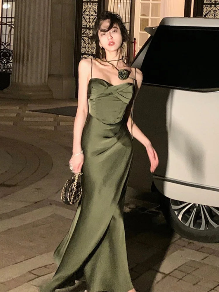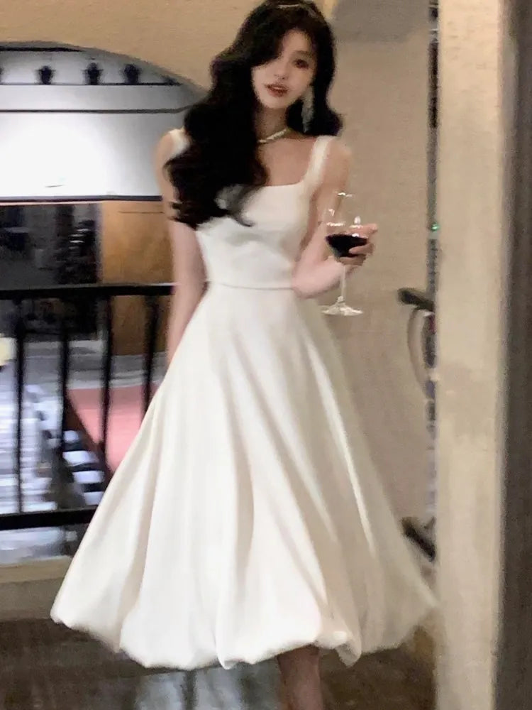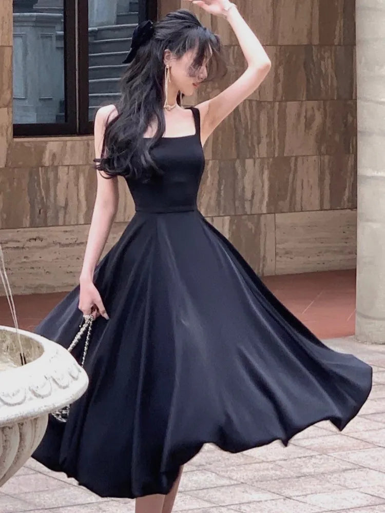 Elegant Satin Midi Dresses for Women Solid Sleeveless Aline Summer Evening Party Dress French Vintage Prom Robe Vestido Mujer