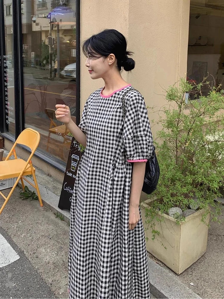 Korean Fashion Vintage Dress 2024 Summer Contrast Plaid Casual Puff Short Sleeve Dresses Women High Waist Vestidos