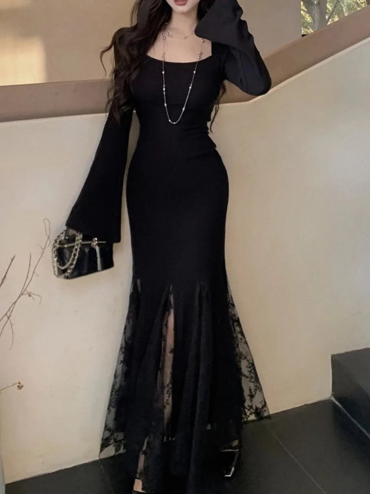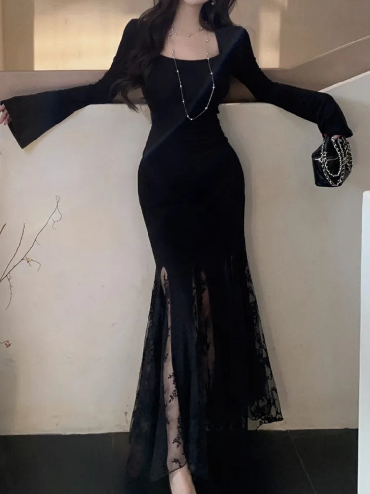 New Spring Summer Vintage Bodycon Solid Chic Women Black Dress Elegant Slim Lace Patchwork Party Prom Vestidos Female Clothes
