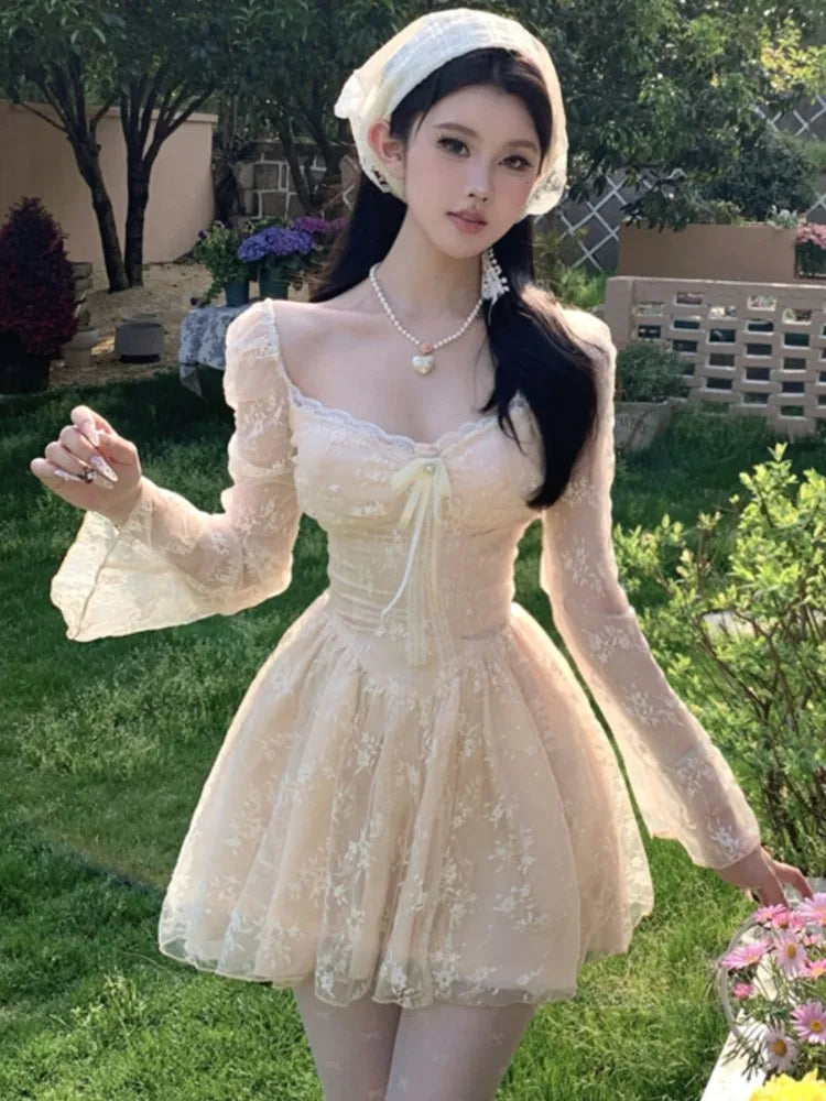 Sweet Fairy Womens Dresses Elegant Lace Patchwork Bow Laceup Square Collar Flare Long Sleeve Party Mini Dress Short Vestidos