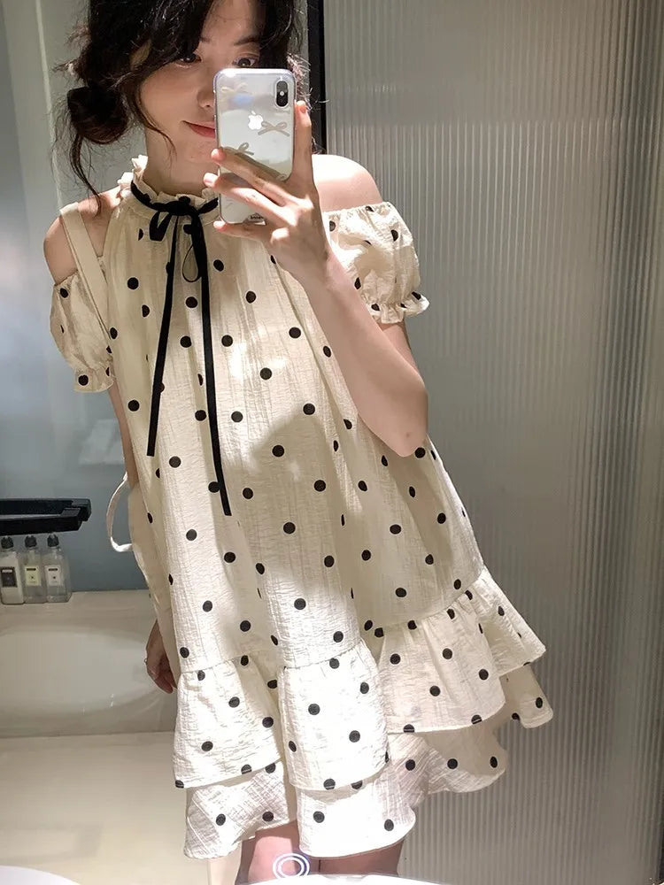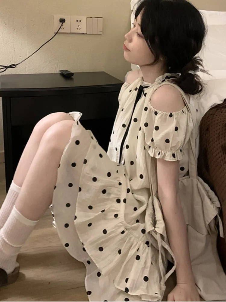 Sweet Dot Short Dress Women Summer New Ruffles Aline Bow Kawaii Birthday Party Dress Y2K Casual Korean Chic Vestido Mujer