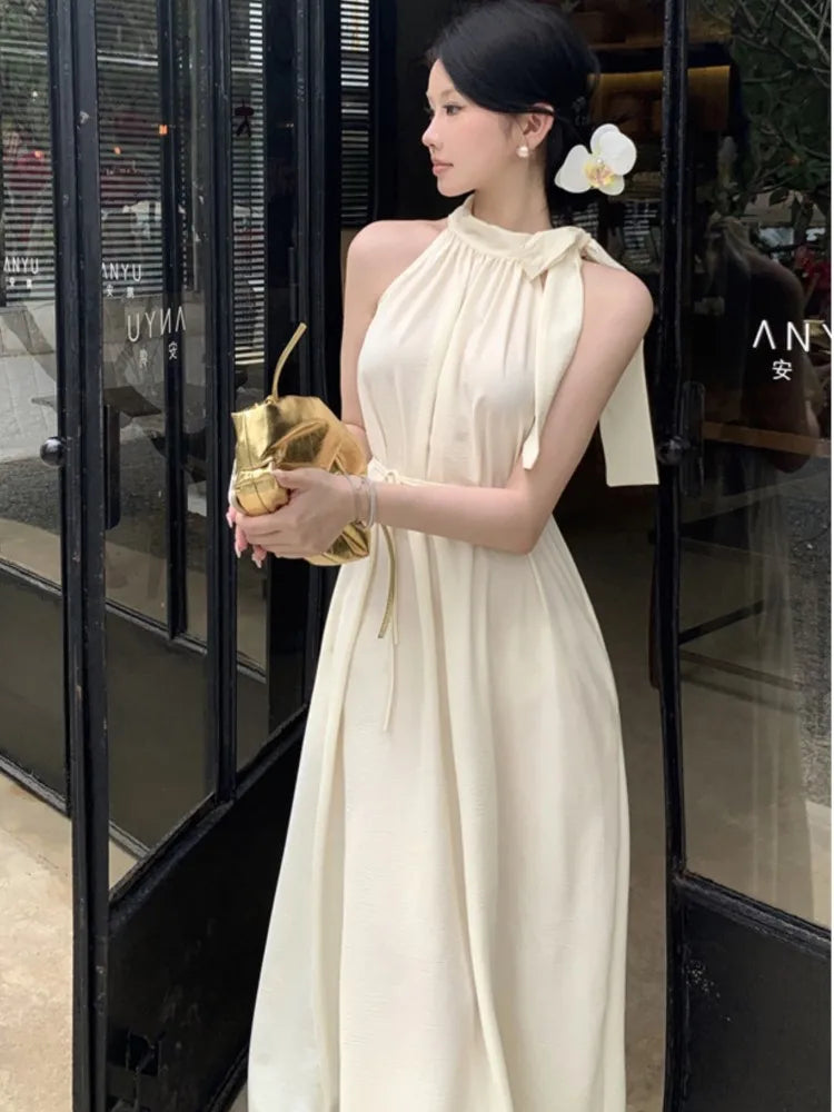 Elegant Dresses for Women Solid New Summer Holiday Style Halter Sleeveless Aline French Evening Dress Party Prom Robe Vestido