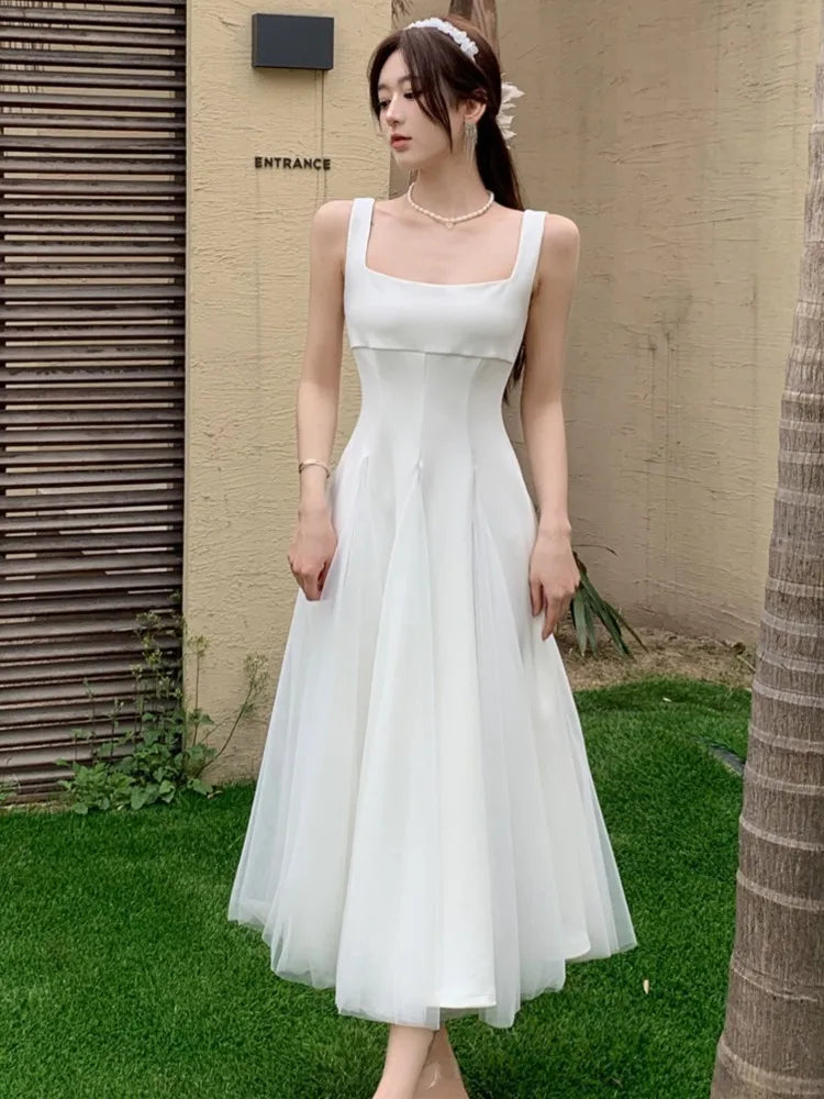 Summer Spring Fairy Womens Dresses Elegant Mesh Patchwork Square Collar Sleeveless Evening Party Midi Dress Female Vestidos Robe