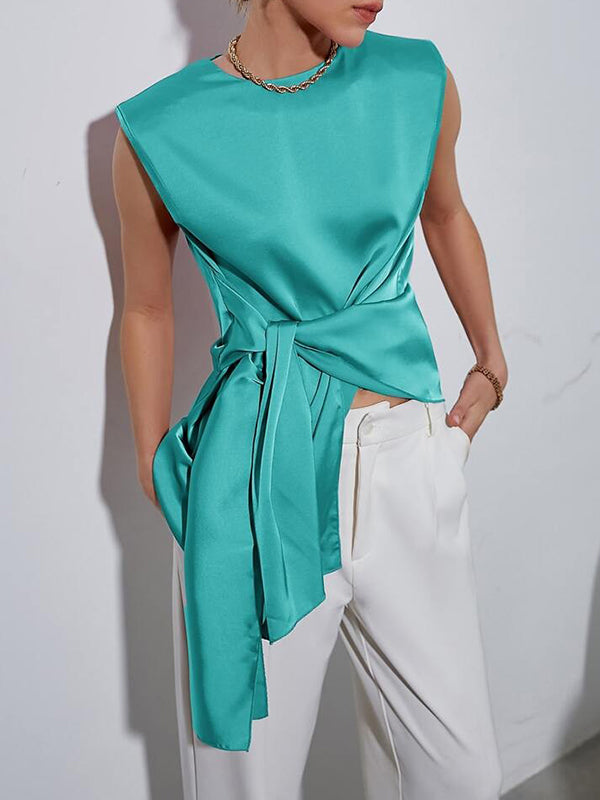 Loose Sleeveless Asymmetric Knot Solid Color Round-neck Vest Top