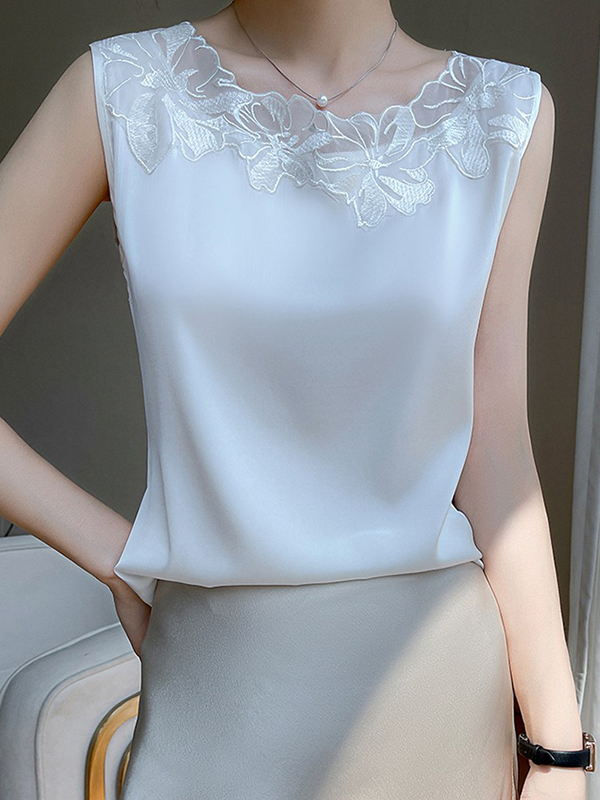 Loose Plus Size See-Through Solid Color Split-Joint Round-Neck Vest Top