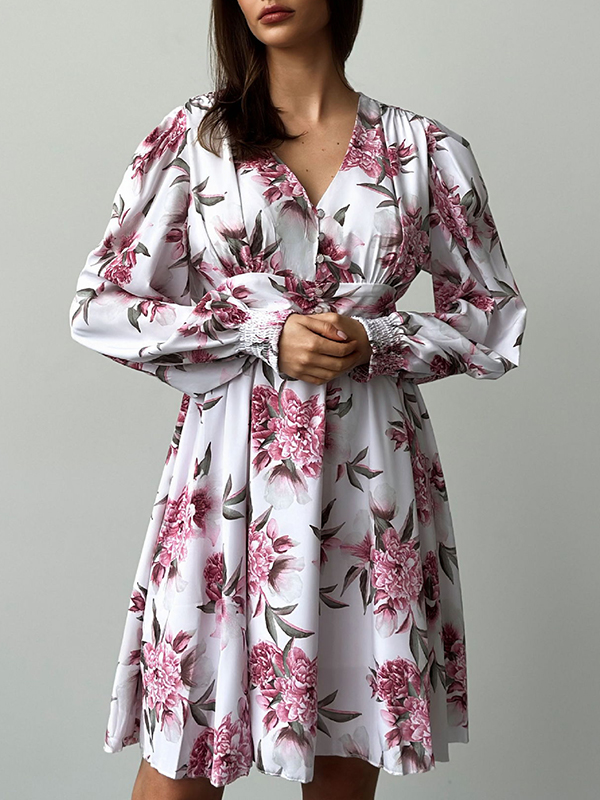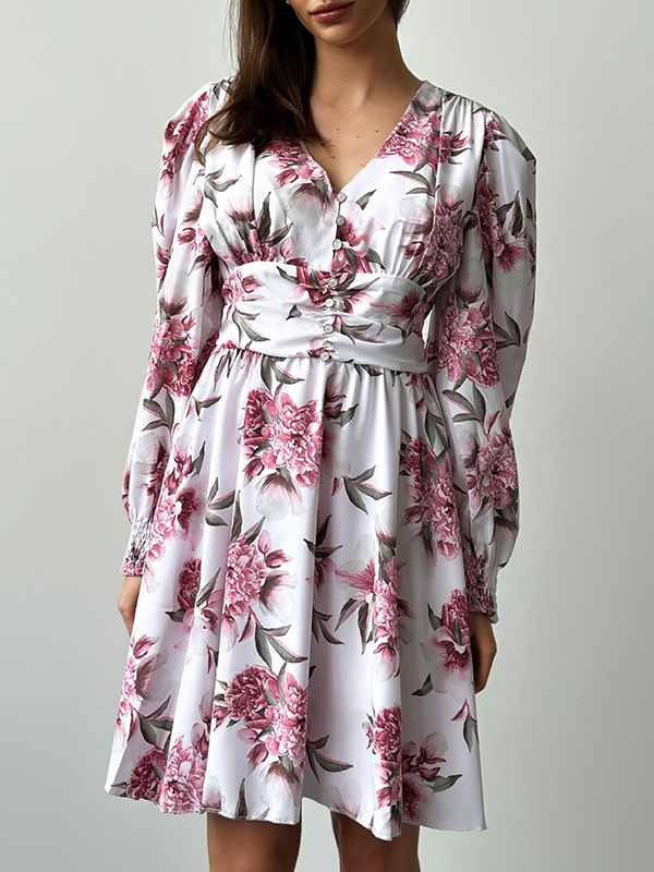 A-Line High Waisted Buttoned Elasticity Flower Print Pleated V-Neck Mini Dresses