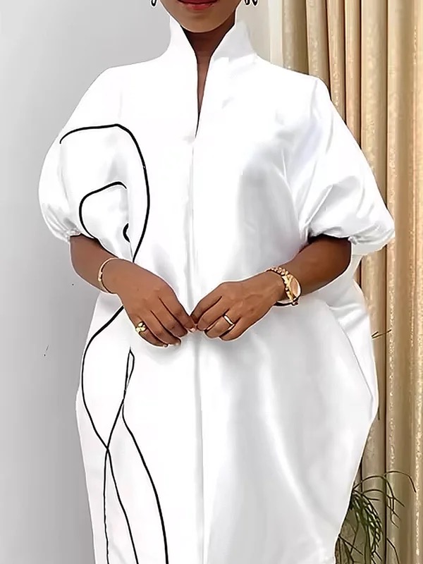 Half Sleeves Loose Elasticity Printed Split-Front Stand Collar Maxi Dresses