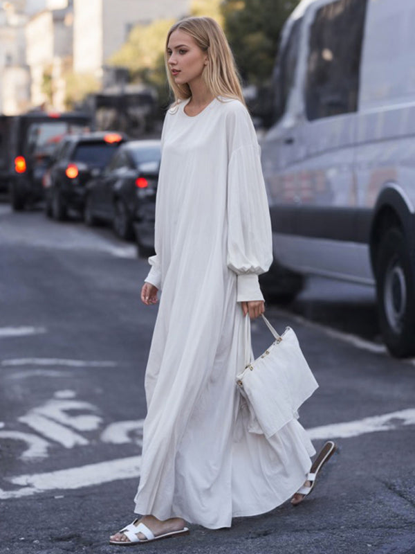 Puff Sleeves Loose Solid Color Round-Neck Maxi Dresses