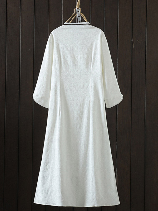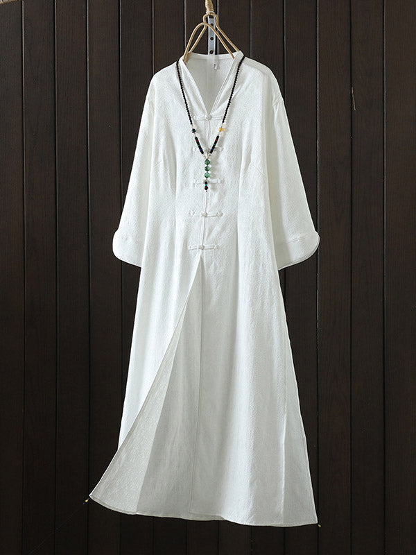 Long Sleeves Loose Chinese Frog Buttons Jacquard Solid Color V-Neck Midi Dresses