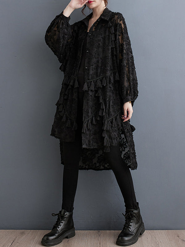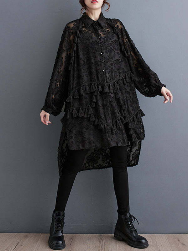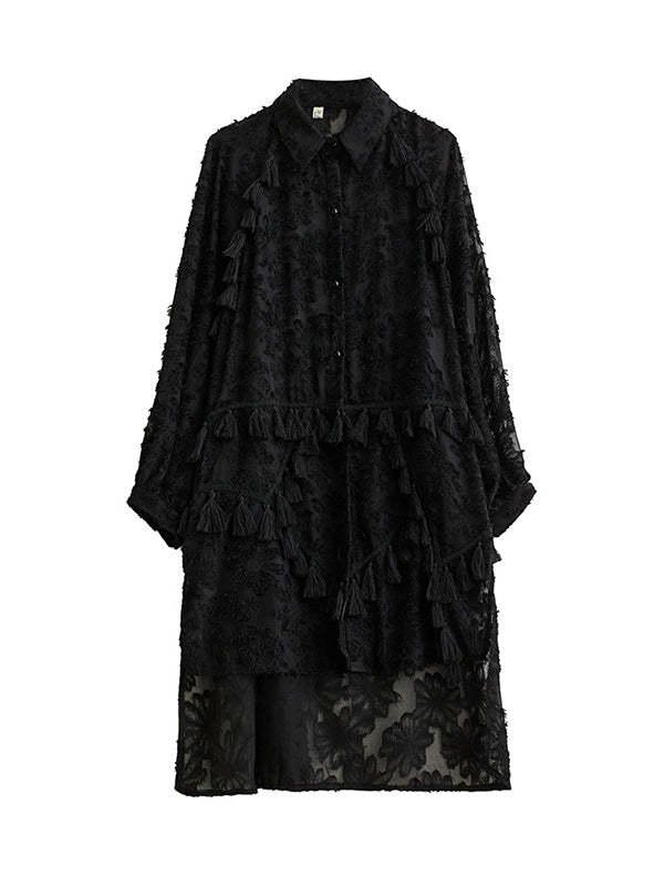 A-line High-low Buttoned Flower Print Solid Color Split-Joint Split-side Tasseled Lapel Midi Dresses