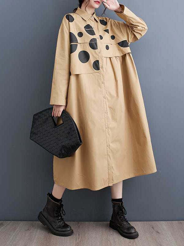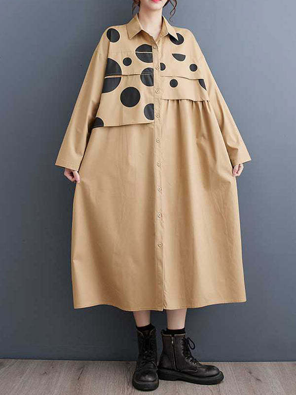A-Line Long Sleeves Asymmetric Buttoned Polka Dot Split-Joint Lapel Midi Dresses