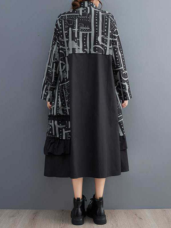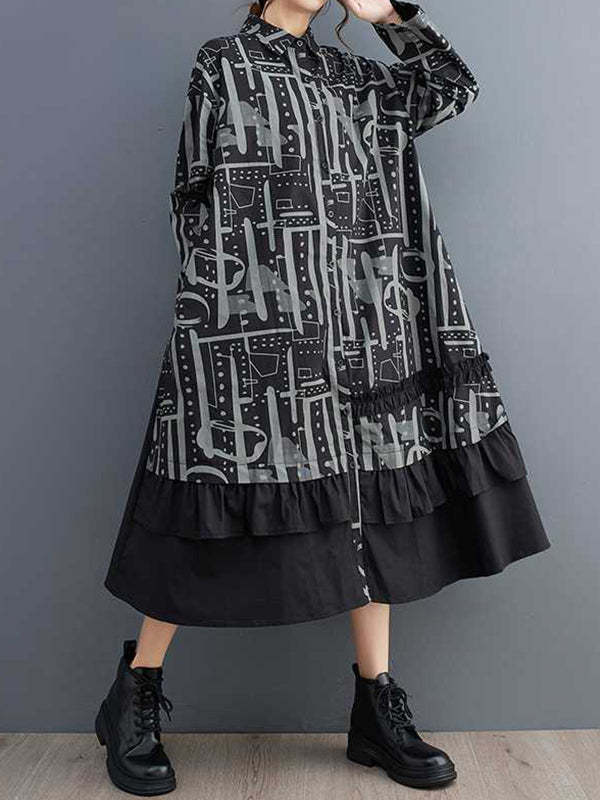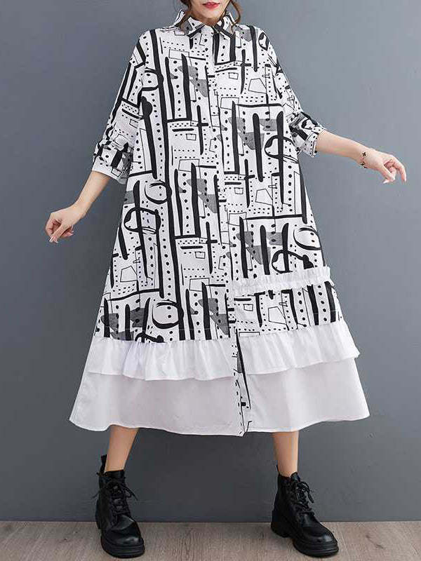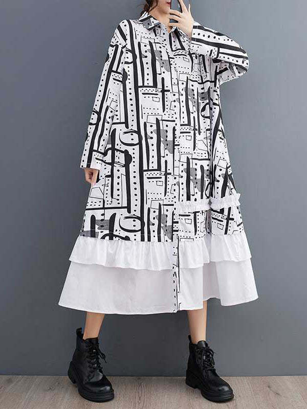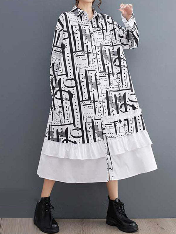 A-Line Long Sleeves Asymmetric Buttoned Printed Split-Joint Lapel Midi Dresses